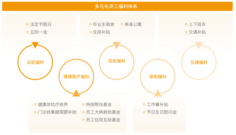 公司建立全面多元化的福利保障體系。除依照法律法規要求為員工繳納的法定五險一金外,我們還為員工提供包括補充醫療、住房保障、交通補貼、餐飲補貼等福利補貼。