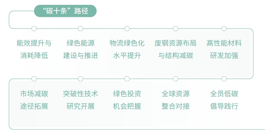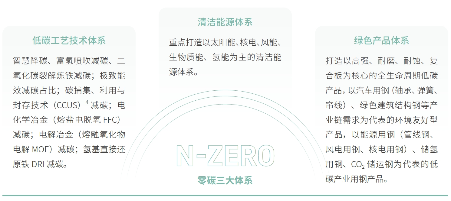 公司全面梳理鋼鐵行業應對氣候變化的技術清單,以源頭減碳、過程降碳和末端固碳為總體思路,實施“碳十條”行動綱要和六條技術路線。此外,公司重點構建“N-ZERO”零碳三大體系,推動公司從“碳冶金”邁向“零碳冶金”,從“碳流程”轉變為“無碳流程”?!癗-ZERO”零碳三大體系與“碳十條”路徑相互配合,共同構成公司“雙碳”工作頂層發展框架。